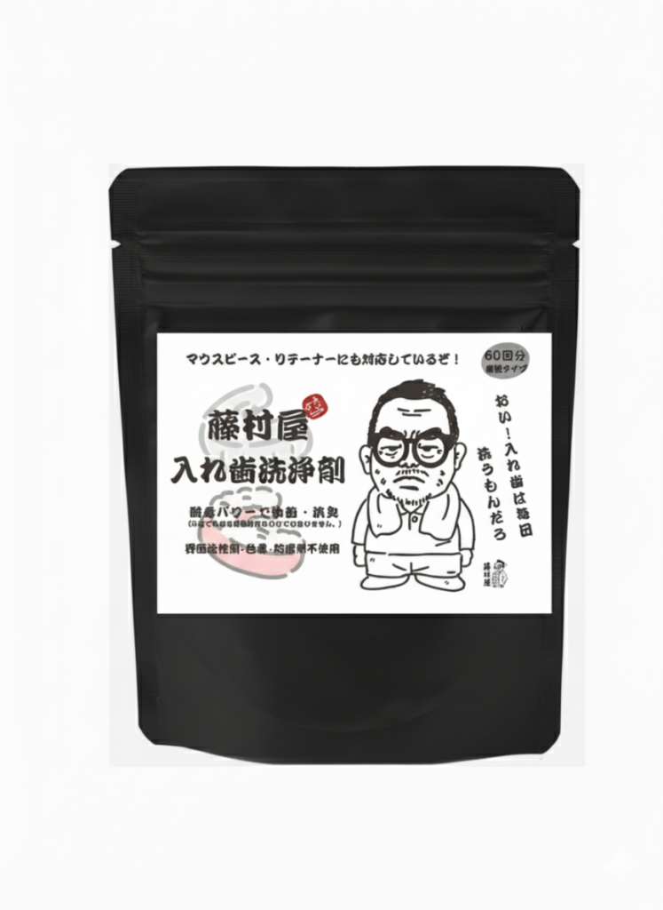 「藤村屋 入れ歯洗浄剤」は、藤村忠寿が実際に使用し、その体験をもとにパッケージデザインにも参画した、こだわりの洗浄剤です。